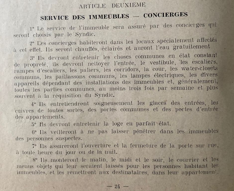 Extrait d'un règlement de copropriété - paragraphe concernant le concierge. Coll. C. Cheuret