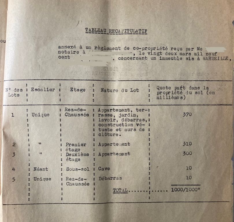 L'ensemble des parts d'une copropriété correspond à 1000/1000ème, c'est ce qui va permettra de répartir la quote-part à payer par chaque propriétaire. Exemple d'un règlement de copropriété. Coll. C. Cheuret
