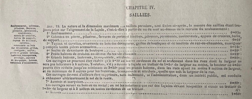 Extrait du règlement sur les constructions en saillies sur la voie publique. Règlementation établie par les Ponts et Chaussées