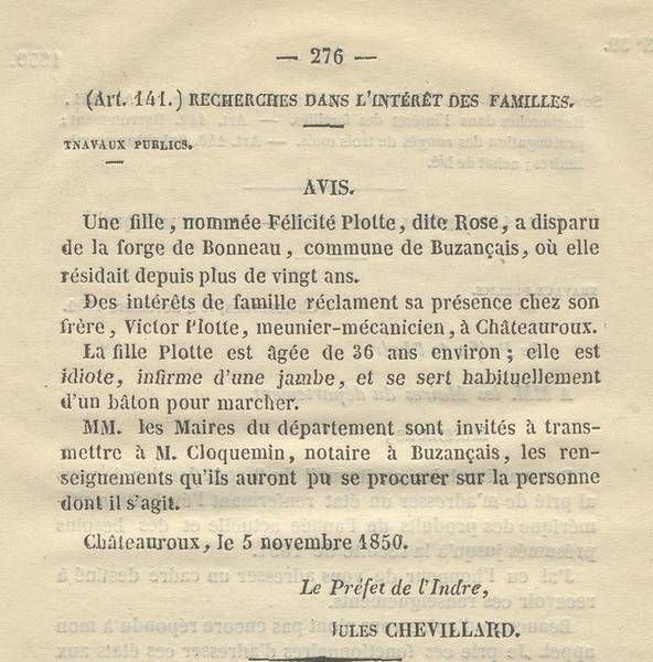 Exemple d'un avis de recherche dans l'intérêt des familles - Préfecture de l'Indre - 1850 - Numérisé par la BNF et visible sur le site Gallica.